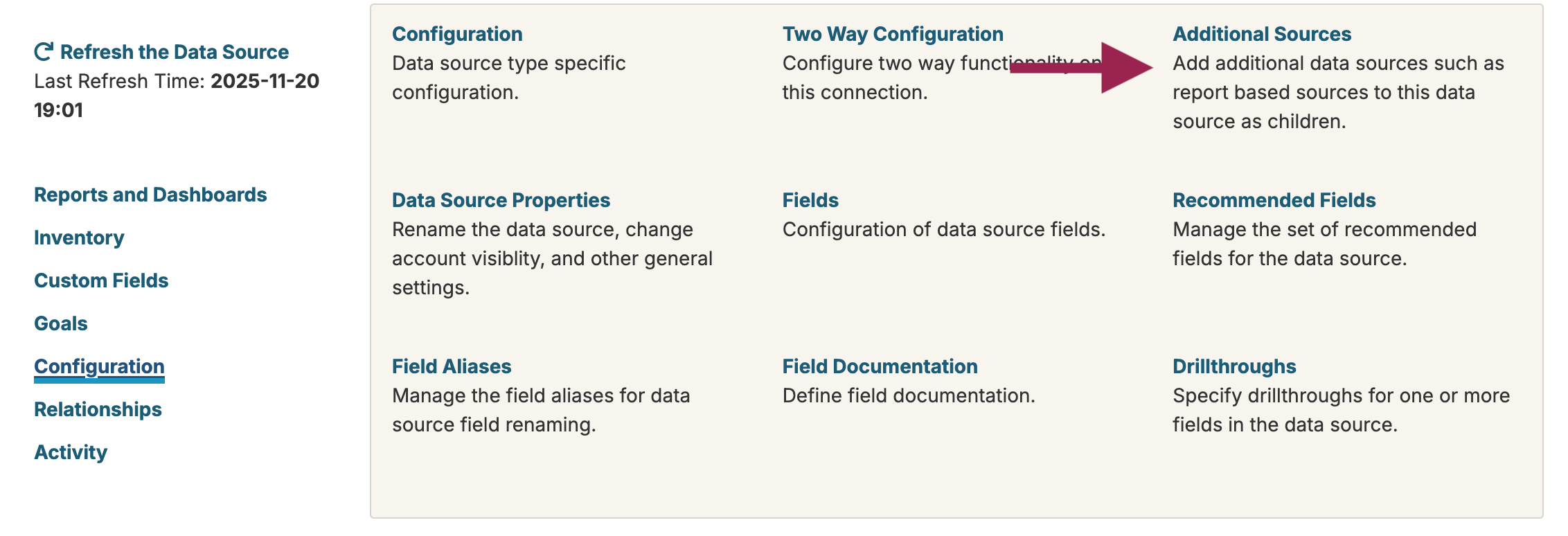 To add data from one of these sources directly to a more complex data source, go to the more complex data source, click on Configuration, and do Additional Sources: