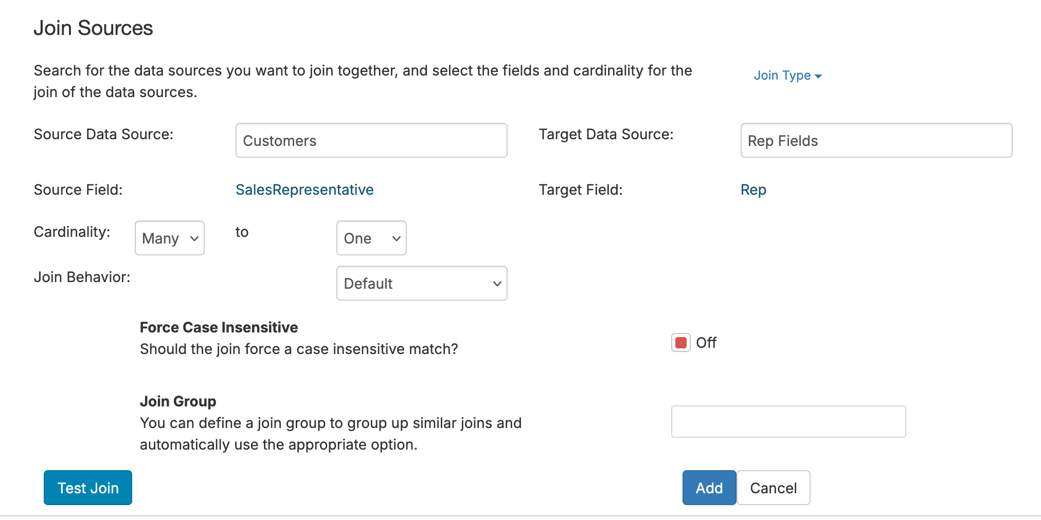 Next, you need to join this source to your data in some way. In this case, we have a rep field in the spreadsheet we're adding, so we'll scroll down, click on Add Join, and set up a join field from Customer Rep to the Rep field in our spreadsheet source. For more information on joins, see Joining Data Sources.
