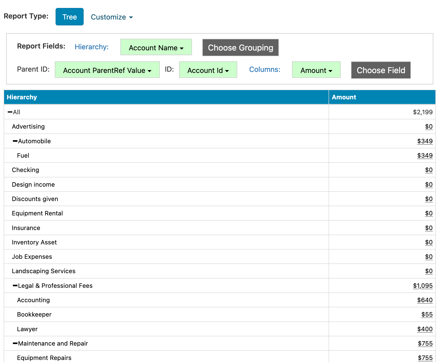 A Tree is a hierarchical view of tabular data. Unlike Summary reports, a tree enables you to expand and collapse levels of the hierarchy.