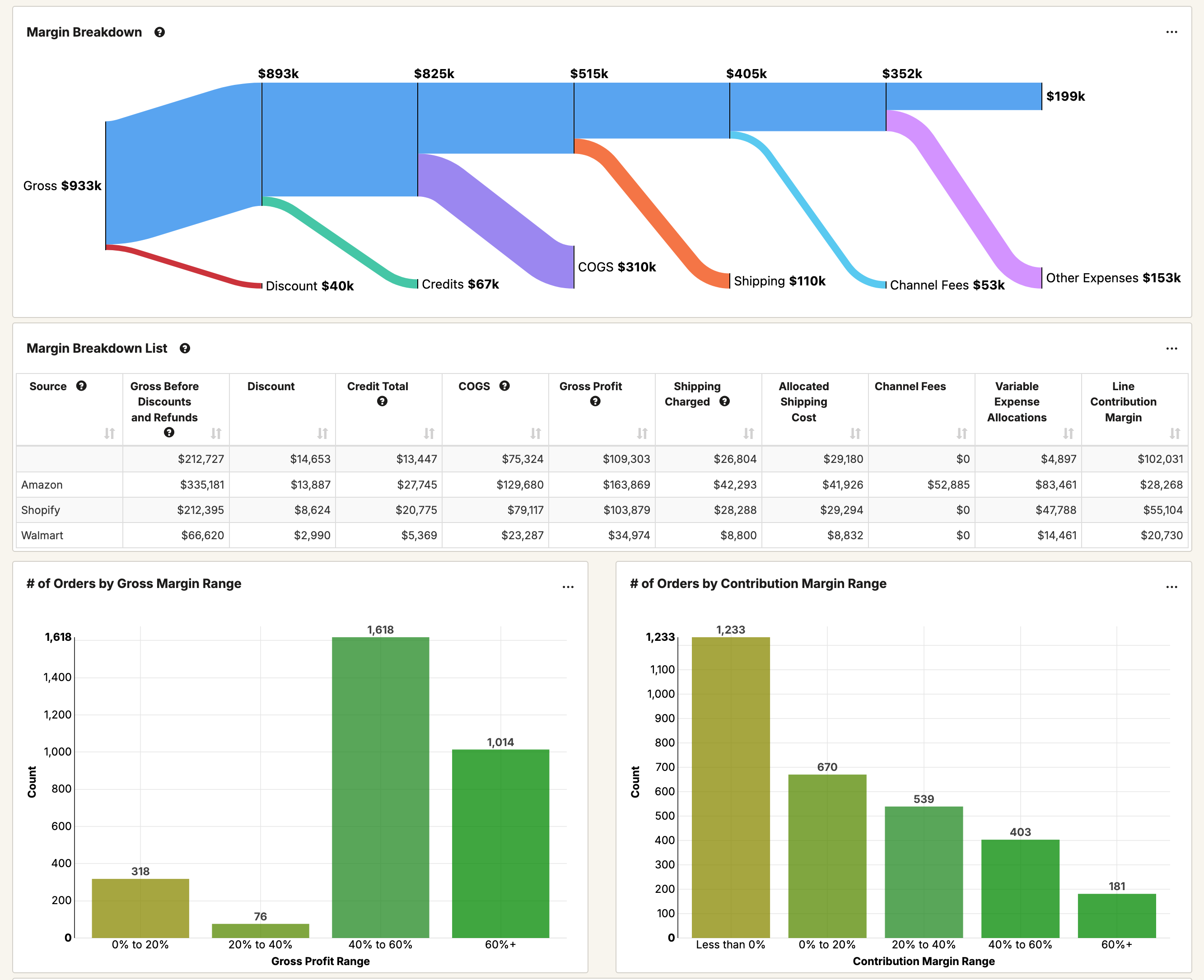 Using Easy Insight, you can report on both gross and contribution profit. Gross profit reflects your sales minus discounts, returns, and COGS (cost of goods sold). These are all expenses that are typically found in your inventory management system. Contribution profit takes into account other expenses that live outside of your inventory system: